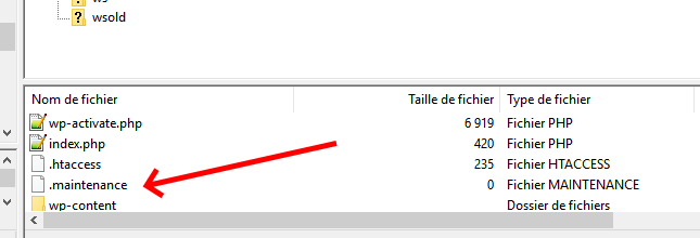 Connectez vous en FTP ou en SFTP à votre serveur. Ensuite, vous devez aller dans la racine de votre site. Trouvez le fichier « .maintenance » dans votre dossier racine et supprimez-le.